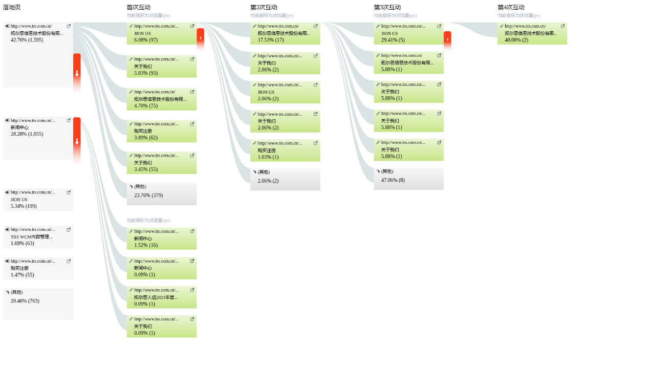跟踪记录每一个访问用户的行为轨迹,将整个用户群体的路径典型化分析,帮助运营团队对典型路径进行识别与特性分析,有助于门户网站的信息结构的优化,运营策略的调整。